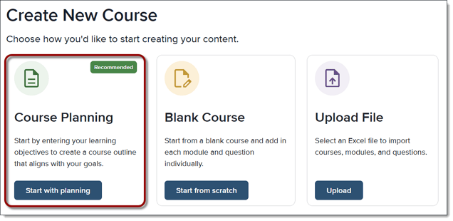 - Course Planning (AI Enabled, Recommended): Start by entering your learning objectives to create a course outline that aligns with your goals.