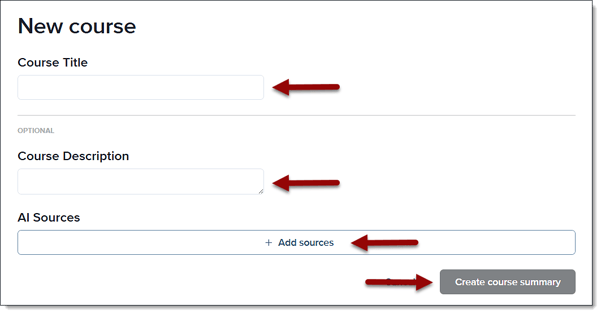 From there, you’ll enter your Course Title and Course Description, and select your AI Sources. After you're happy with those elements, click Create course summary.