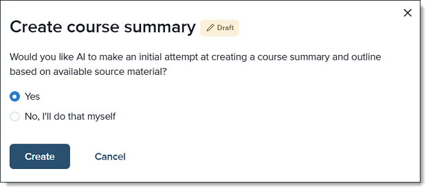 When creating your course, you have the option to write your own course summary or have AI make an initial course summary and outline based on your selected source material.