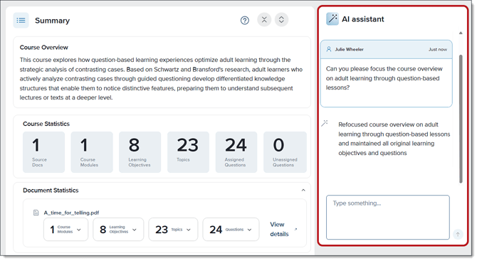 Depending on the length and number of sources you select, the summary creation may take some time. After the course summary is created (either with AI or written by an author,) you have the option to edit your course summary manually or through the AI Assistant.