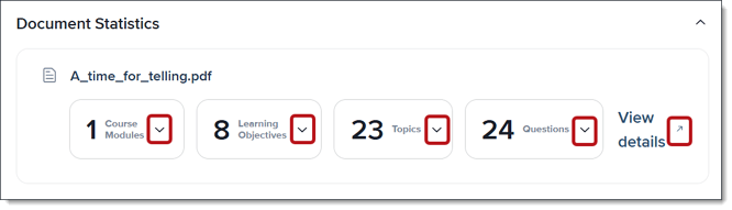 The Document Statistics panel provides a great deal of information on your source(s) and how they fit into your course. Click on any of the carrots to view the associated dropdown menu. From here you can get a more granular view of each course element. You cannot edit any of these elements from the statistics panel, but you'll be able to make any edits you like in the Outline view once you've generated your course.