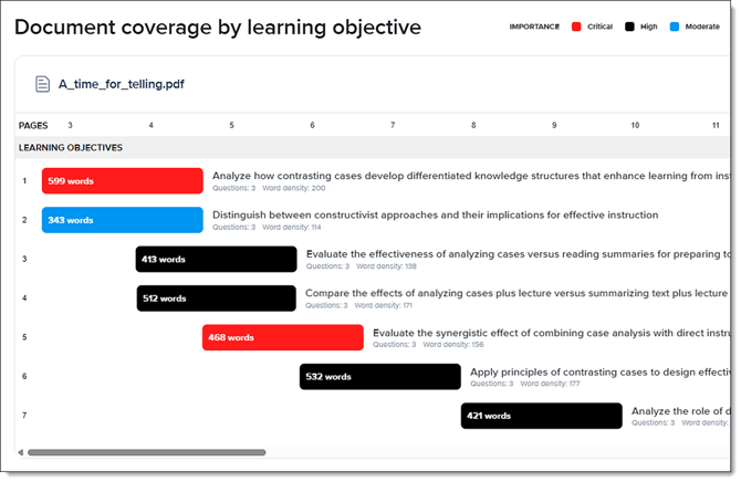 To view an even more granular view of how Amplifire will use your source, click View details to open the Document coverage by learning objective view. Each learning objective will be listed along with where in the document it was found, its importance, how many words it comprises, and the number of questions associated with it.