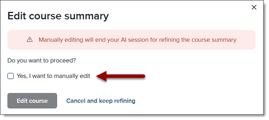 - Click the edit button on the Course Summary page and acknowledge that manually editing will end your AI session for refining the course summary