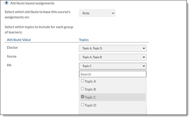 From there, think about how you want to divide up your course based on what's included and who needs the information. In the example below, the attribute Role has the values Doctor, Nurse, and PA under it.