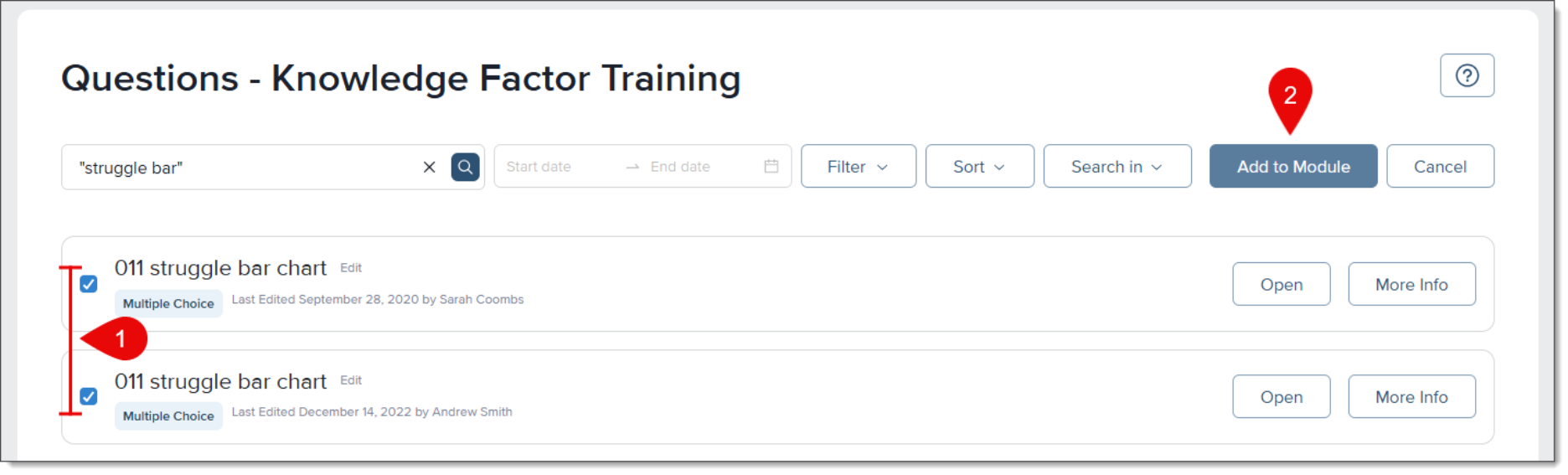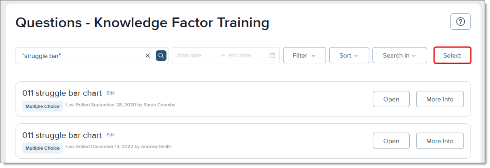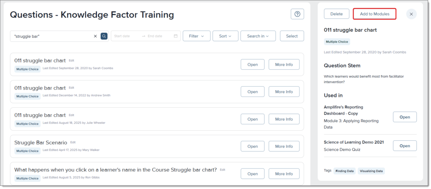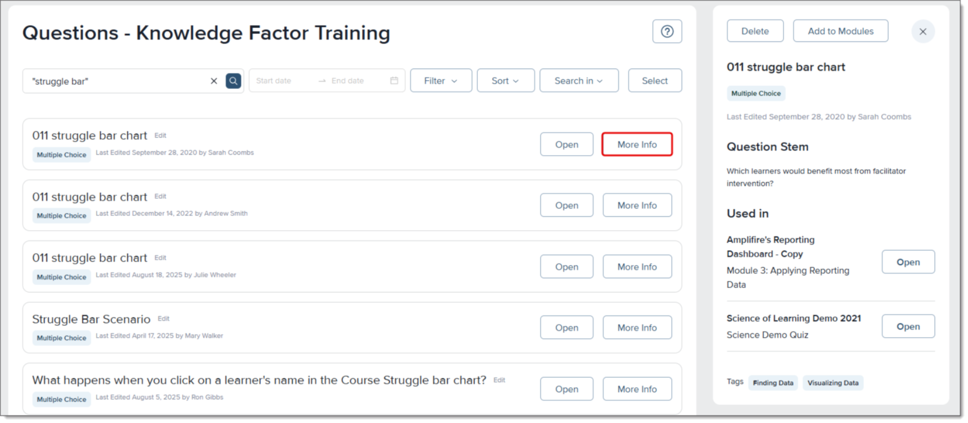 Click the More Info button to see details about the question, including the type of question, the question stem and which courses the question is used in.