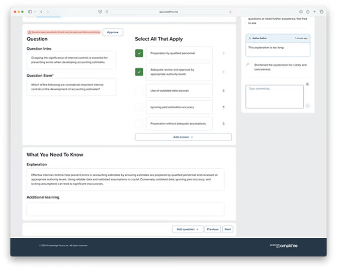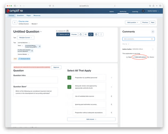 When reviewing comments from a SME, you can send the content from the question to AI by pressing the refine button. This will open the AI panel with the comment text pre-populated.