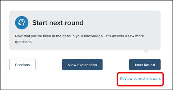 At the end of each learning burst you will see a message to start the next round. At this time, you can click Review correct answers and which will allow you to view all the questions and explanations for that round.