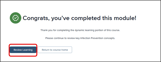At the end of the module, you will see the Congrats You can click Review Learning which will take you to an overview page of all the questions.