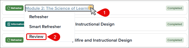 After you have completed a course, navigate to your course home page, click the course name and then select Review. This will take you to an overview page of all the questions contained in a module. Again, use the carrot to open a question and then click View the question to see the question in its entirety and the associated explanation.